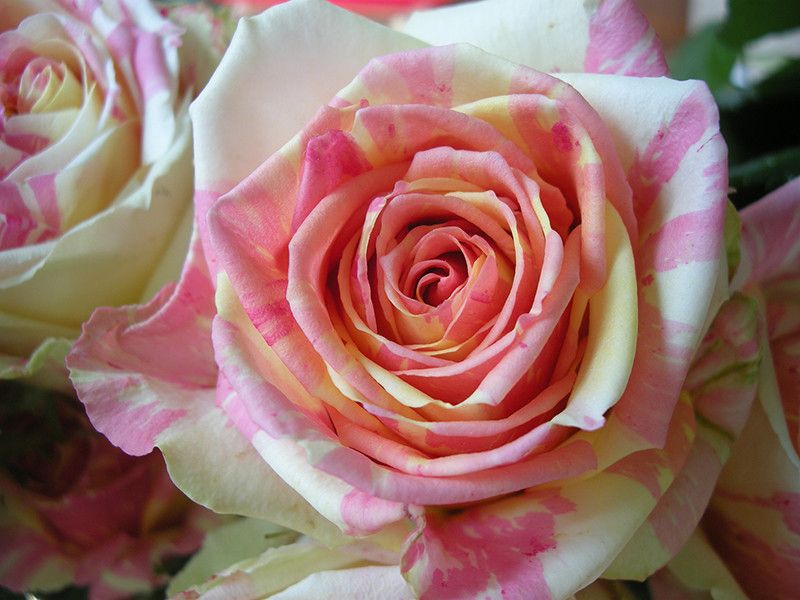 Роза «Фиеста» – это уникальный сорт французской селекции, который привлекает внимание своей необычной градиентной окраской. Цветы этого сорта переходят от молочно-желтого к нежно-розовому, с лимонными и кремовыми полосками, создавая эффектный и запоминающийся вид. Распустившиеся цветы имеют ромбовидную форму, что придает им особую изысканность. С расстояния роза может казаться одноцветной, что добавляет ей дополнительного шарма. Благодаря красивым молочным переходам, этот сорт часто называют «карамельной розой».